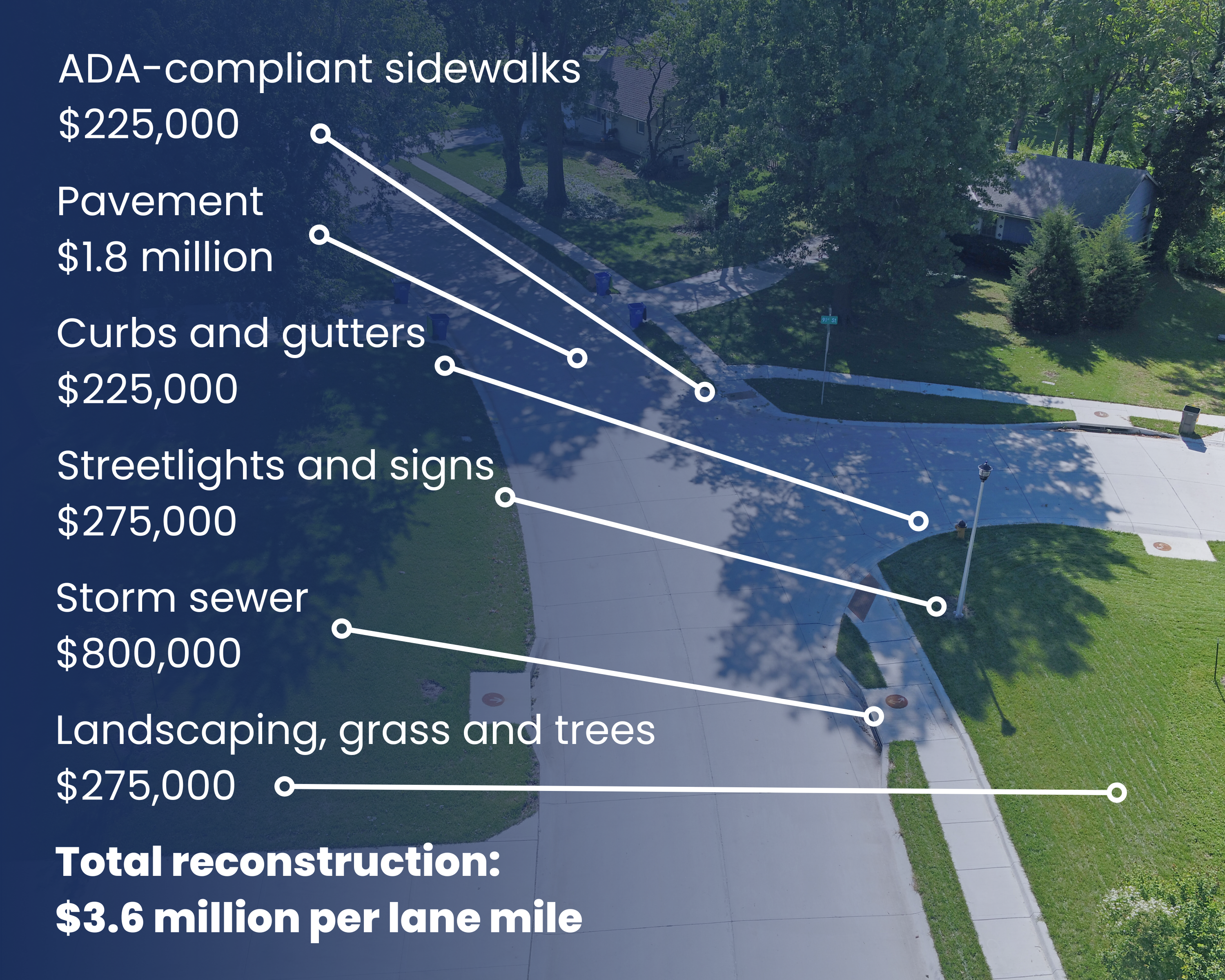 It costs approximately $3.6 million to build a mile of a typical residential street in Overland Park. This graphic shows both the elements required for streets to meet engineering standards and the costs associated with each of those elements.