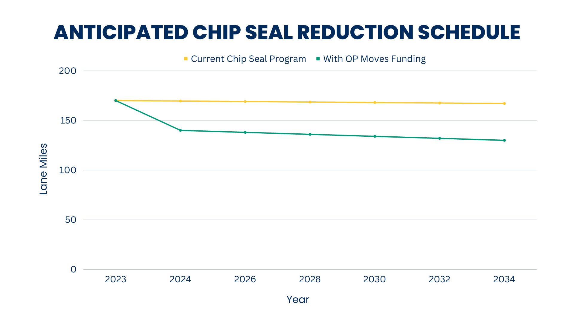 The approval of the OP Moves initiative ensures there will be an immediate 18% reduction in the use of chip seal beginning in 2025. Funding from OP Moves will also allow the City to perform more rehabilitation work, including mill and overlay, asphalt and concrete methods to keep streets in good condition.