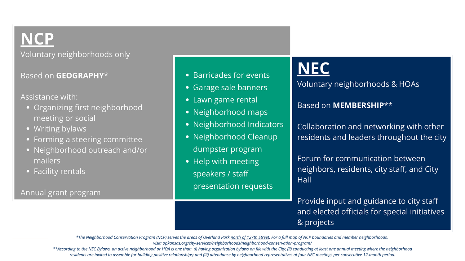 Overland Park initiated the Neighborhood Conservation Program in 1991 to help sustain neighborhoods, maintain property values and offer quality, affordable housing. Since then, individual residents have organized into groups to connect with neighbors and local government leaders, forming partnerships that enrich Overland Park’s livability.