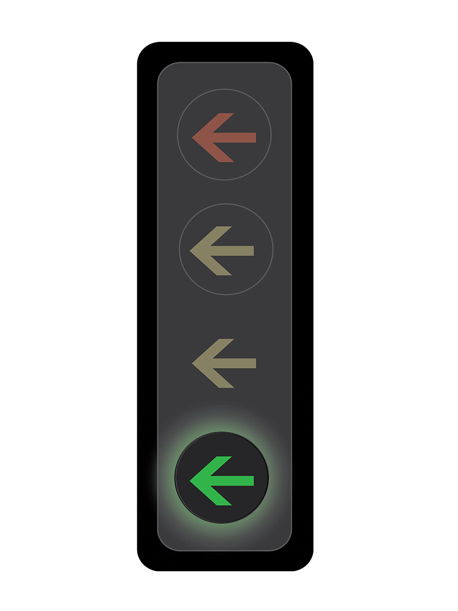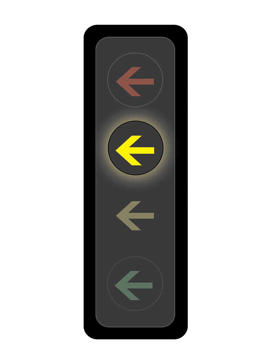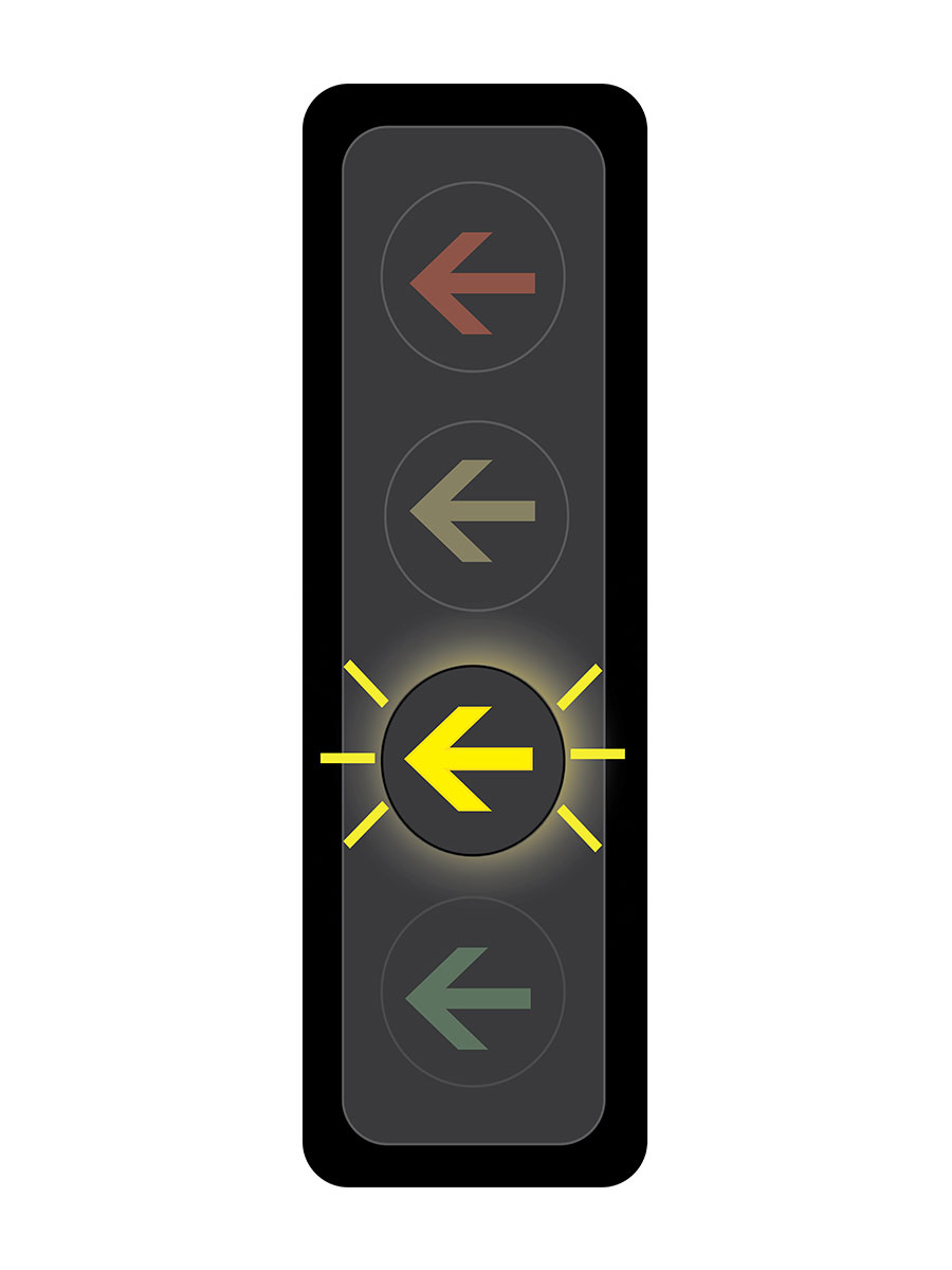 A steady green arrow indicates that drivers making a left turn have the right of way.