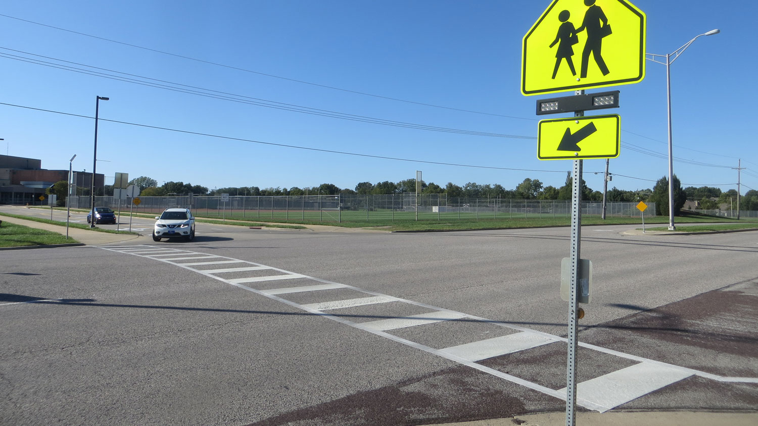 RRFBs have flashing yellow lights to let drivers know a pedestrian is crossing the street. Pedestrians should push the button to alert drivers that they are crossing.