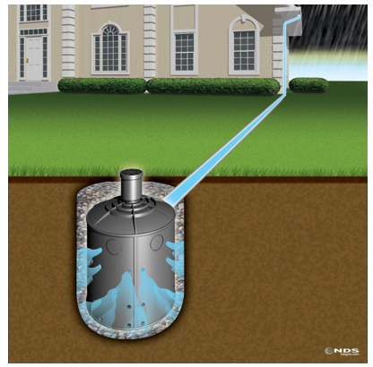 A dry well, also called a seepage pit, is an underground storage facility that temporarily stores stormwater runoff. Pipes installed to drain water from roof gutters can directly connect to the dry well, which may be a gravel-filled pit, a prefabricated storage chamber made from plastic, concrete or a pipe segment. Runoff flows into the dry well and slowly drains or infiltrates into the surrounding soil. In the event of a heavy storm or frequent storms, an overflow pipe is used to ensure any additional runoff is safely directed downstream.