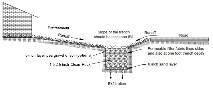 An infiltration trench is a gravel-filled trench that collects stormwater runoff from impervious surfaces, temporarily storing it in the stone’s void spaces and allowing it to slowly seep, or infiltrate, into the surrounding soil. The trench manages runoff, recharges groundwater and filters pollutants like sediment.