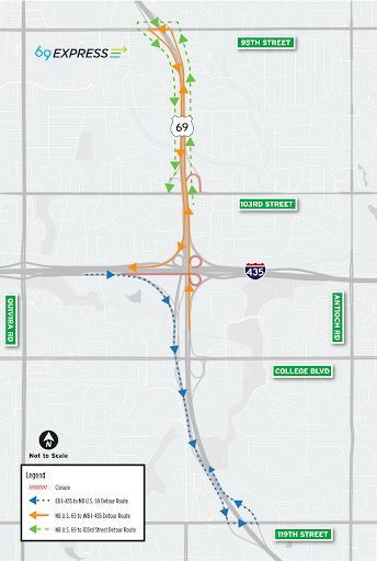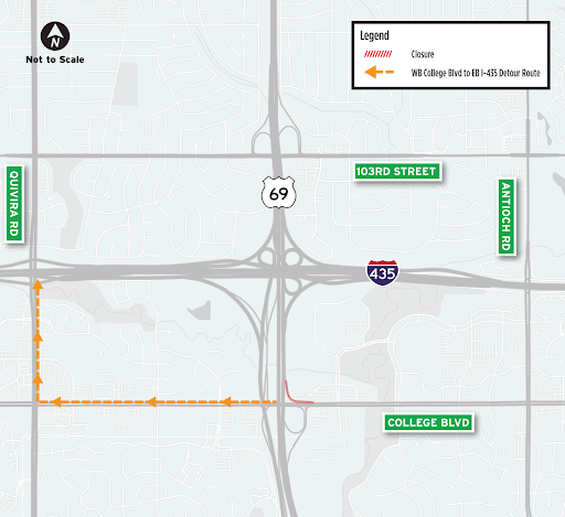 Beginning May 7 at 8 p.m., ramps from eastbound I-435 to northbound U.S. 69, northbound U.S. 69 to westbound I-435, northbound U.S. 69 to 103rd Street and westbound College Blvd. to eastbound I-435 will fully close to traffic for roadway and ramp reconstruction and bridge rehabilitation.