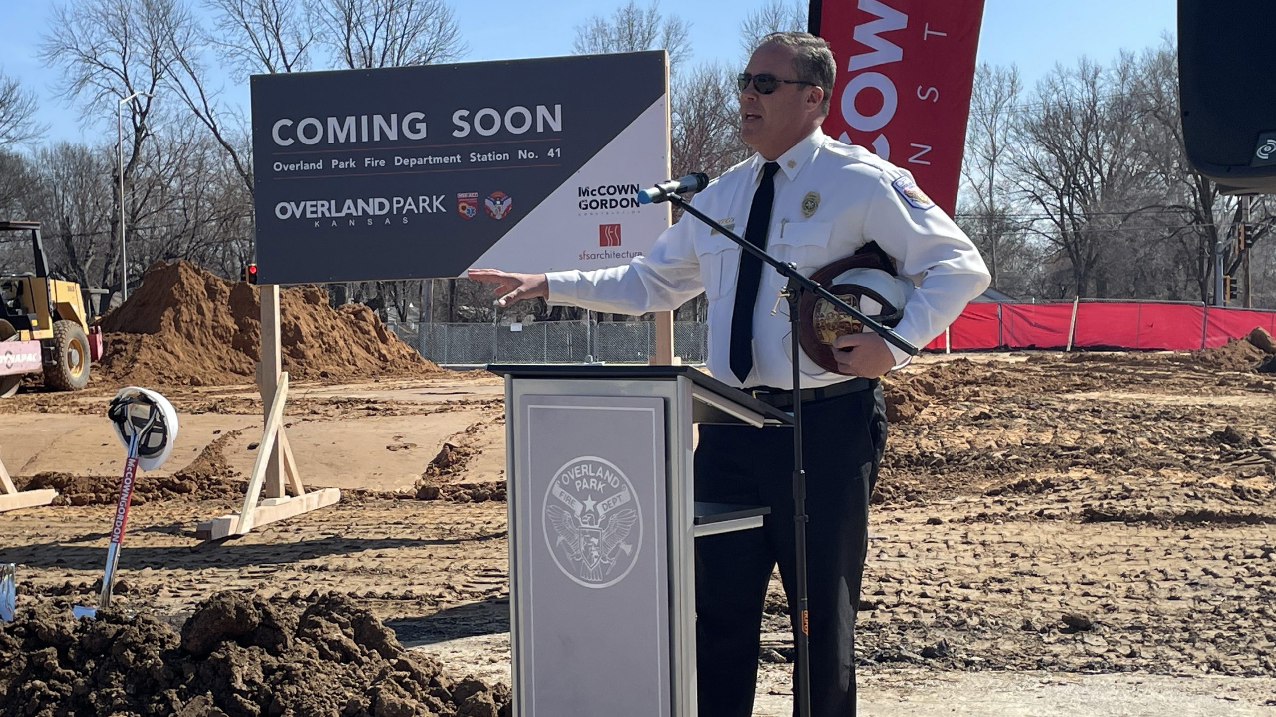Mayor Curt Skoog spoke to event attendees about the significance of the new fire station. He and City Manager Lori Curtis Luther participated in the ceremonial groundbreaking alongside Fire Chief Bryan Dehner and Overland Park Fire Department staff as well as city and county officials.