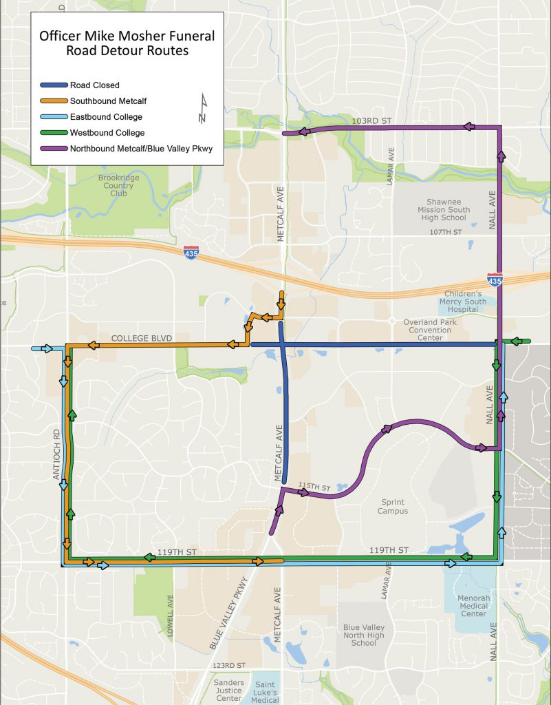 Wednesday morning at approximately 8 a.m., Metcalf will be closed between 110th and 115th and College will be closed between Nall and Marty for Officer Mosher’s funeral services. This closure will last into the afternoon.
