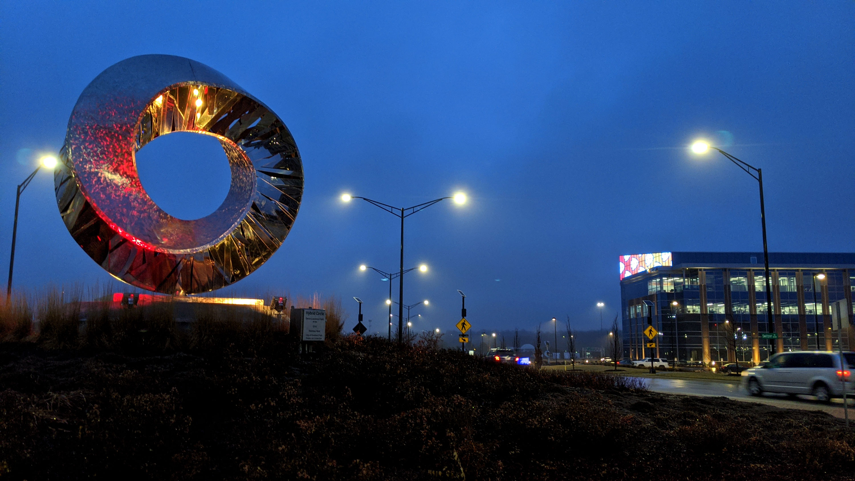 City Place: Hybrid Circle, a public sculpture at City Place, and surrounding buildings are lit up in team colors to celebrate a Chiefs victory.