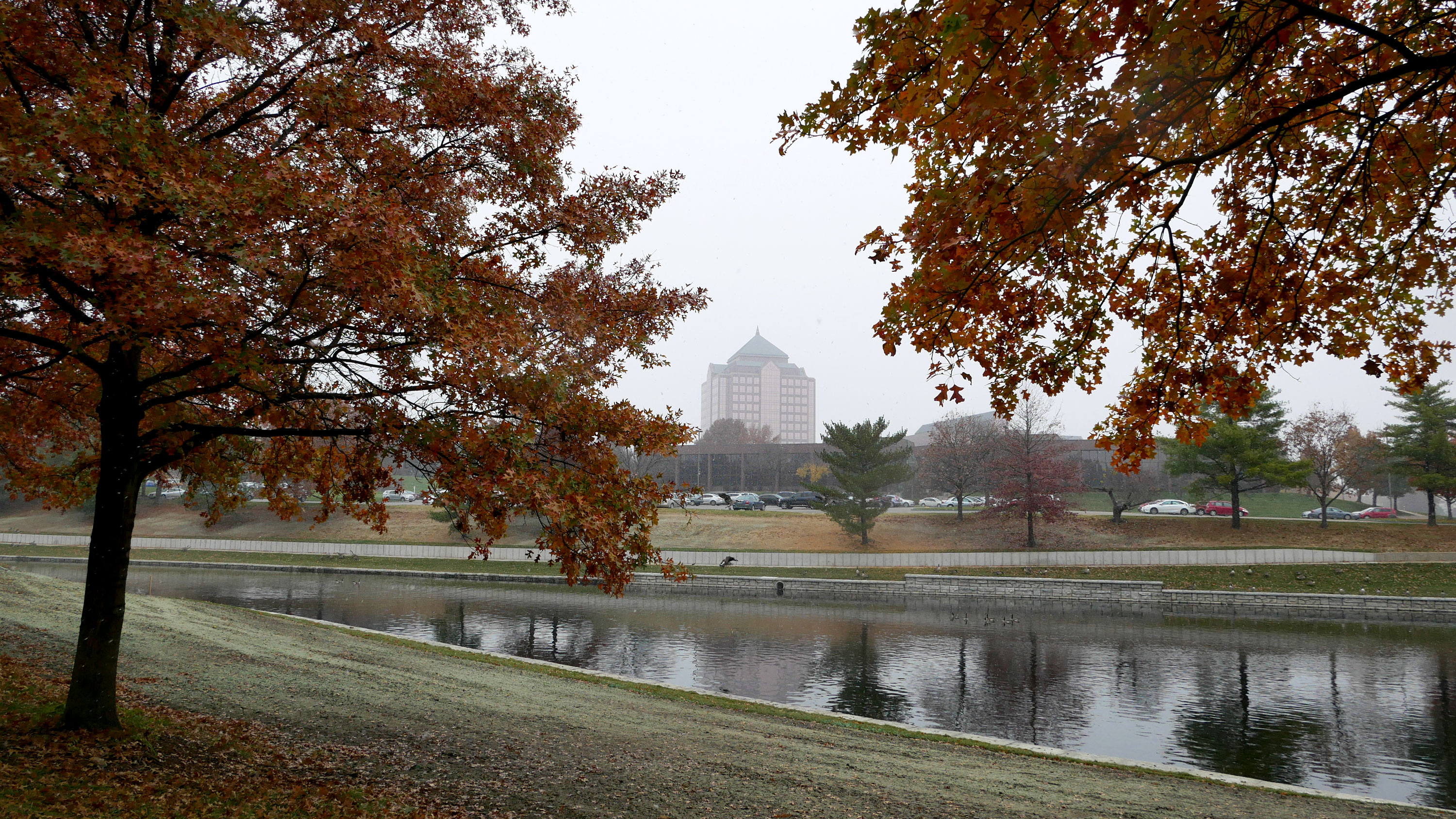 Summercrest Park: Summercrest Lake mirrors a winter sky while fall colors provide a contrast to Lighton Tower in the foggy distance.