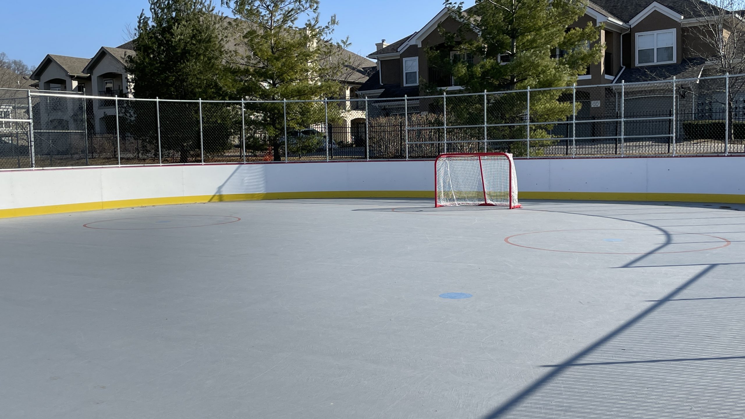The rink is 120 feet by 65 feet and is surrounded by a five foot sideboard and has regulation height and width goal areas. There are player benches on both sides of the rink.