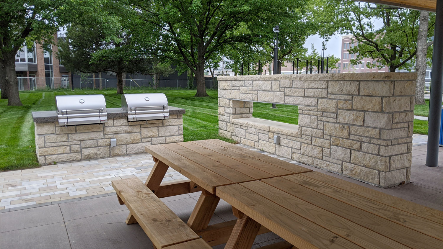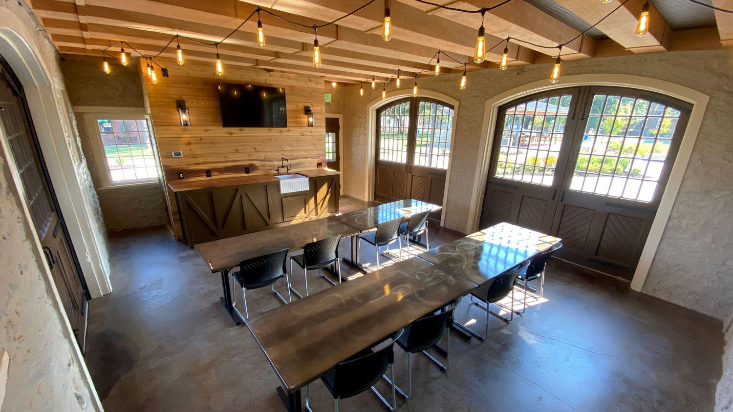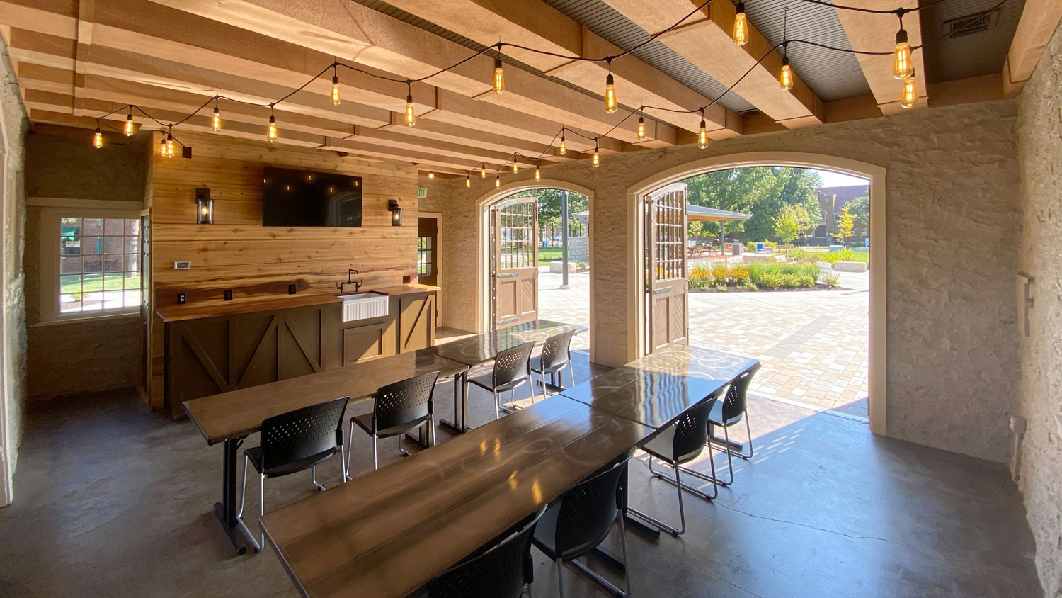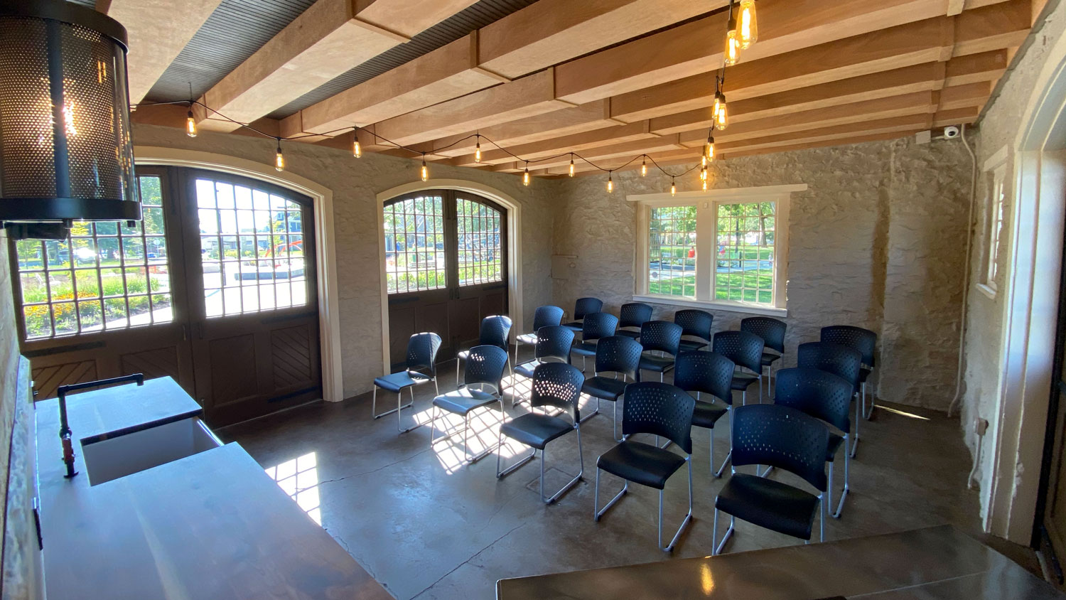 Renovations at the Carriage House in 2020 included refurbishing the building’s tile roof and limestone walls; the addition of cedar beams reminiscent of carriage houses of the era; updating the interior with walnut bartops sourced from nearby Sapling Gove Park, a cedar wall backdrop and industrial finishings; and the addition festoon and warm industrial lighting to provide a warm ambiance for your event. Refurbished original carriage house doors allow your event to remain private to the Carriage House, or flow into the park.