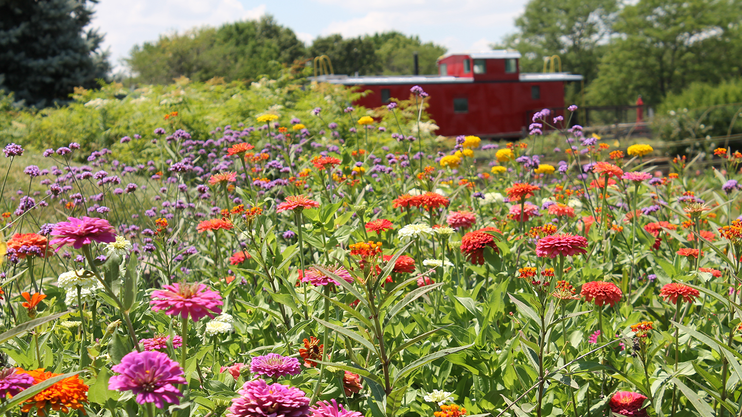 Enjoy the charm of a real train-themed setting surrounded by beautiful gardens, a real railroad caboose and a full-size railroad crossing gate. Model trains wind through mountains, bluffs, streams and a model of Downtown Overland Park throughout your celebration.